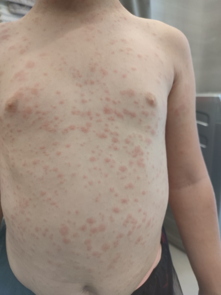 У дочки пошли красные прыщи/пятна по всему телу. Температуры и никаких других симптомов нет, не чешется.