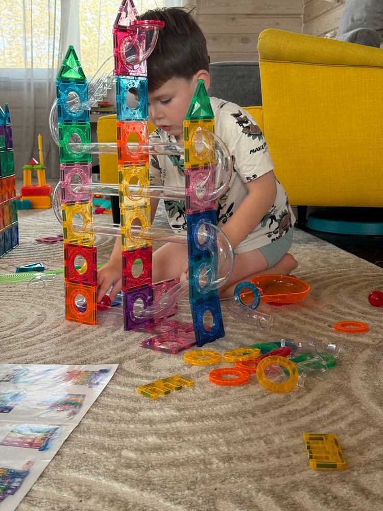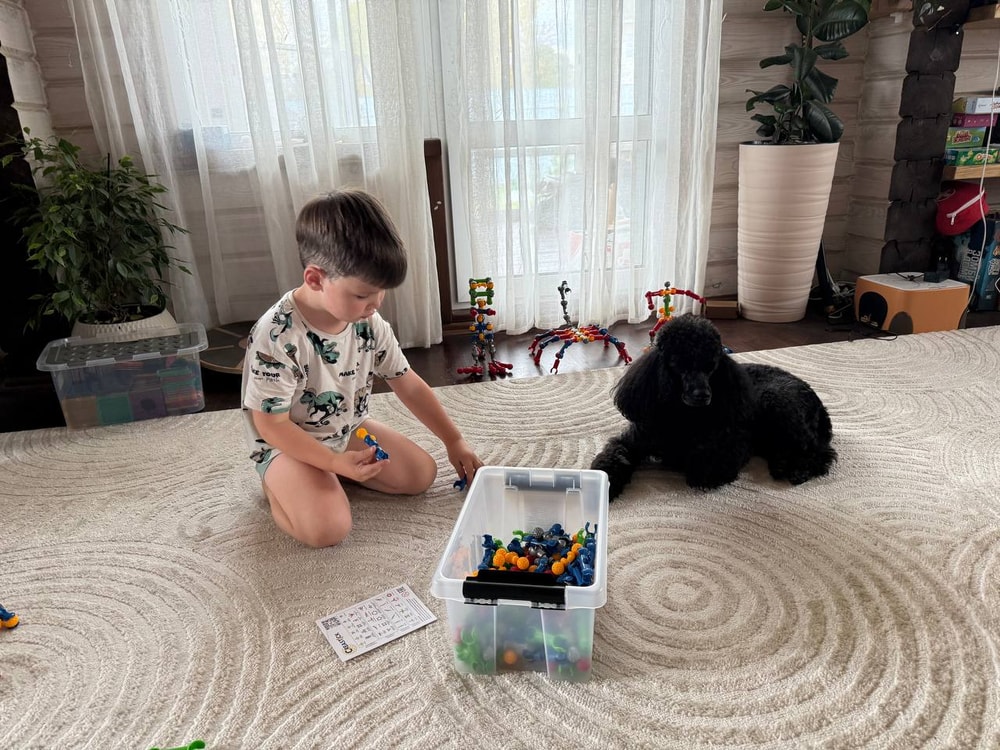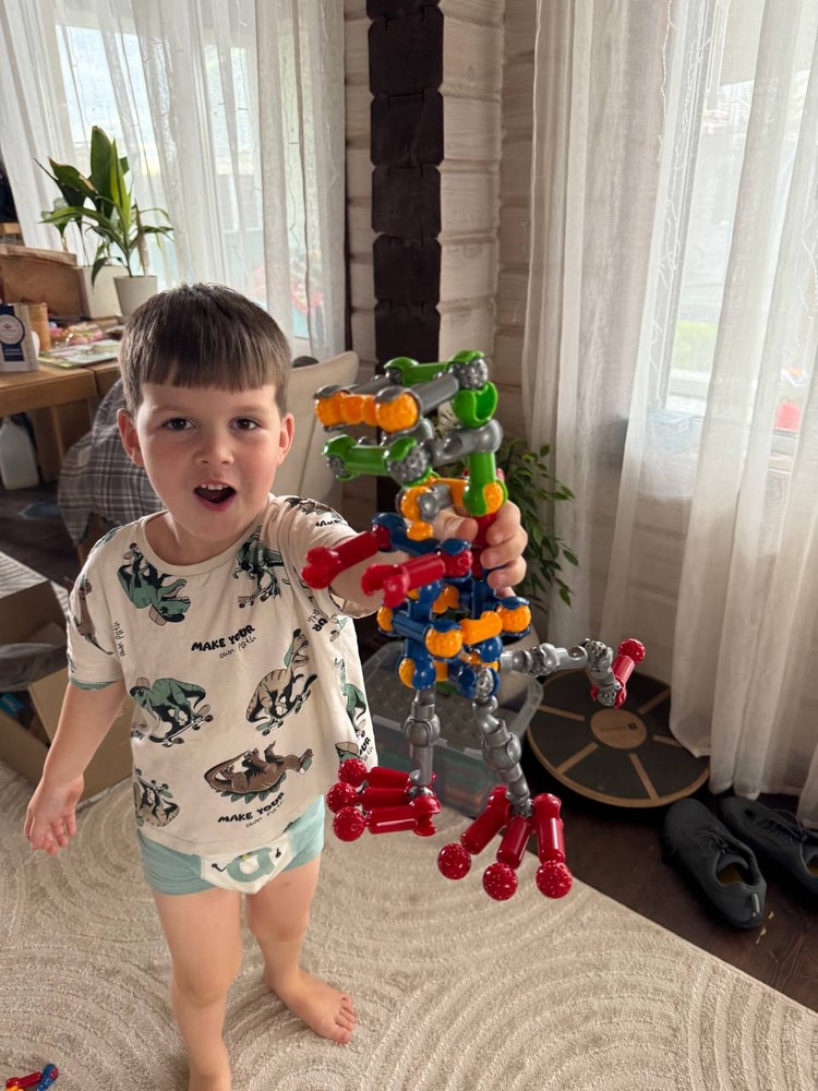 Дорос до возраста конструирования. Сам делает что-то не очень сложное, вроде пистолетика или паука. Все его придумки это всегда про историю.