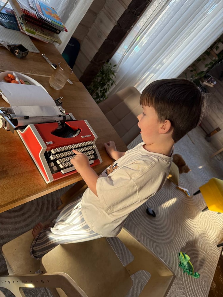 Раз уж речь зашла,про буквы. Ребенок вытащил печатную машинку и занимал сам себя, пока я готовила. Это вообще частое наше взаимодействие : я что-то делаю по дому, а Венька рядом скачет со своими идеями. Вот и тут