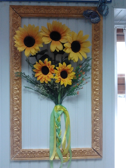 Мы купили потолочную плитку из пенопласта, вырезали середину(получилась рамка и серединка), покрасили основную рамку золотой краской (специальной), а серединную рамочку серебром. Были куплены искуственные фрукты и цветы. Крепились на пластиковые стены на двухсторонний скотч. Получилось в реале очень красиво.