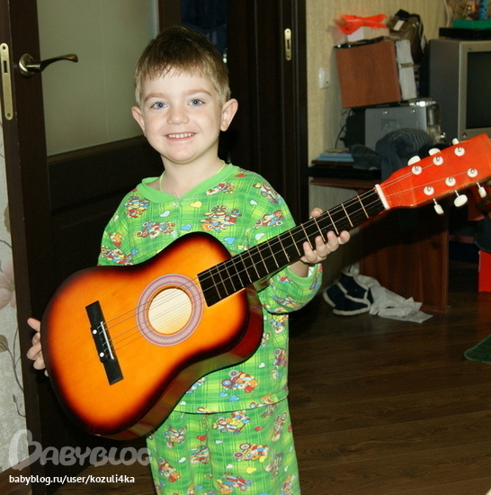 в подарок входил диск с мультом, моделька машины открытка и конечно то что он хотел - гитара!!!
