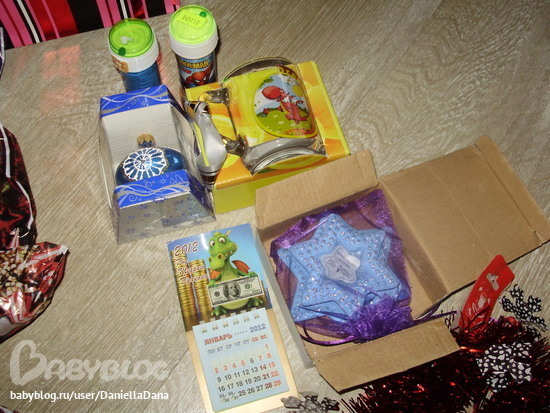 игрушка (просто супер), кружка с Драконом (одна личность ее уже прихватизировала, потому что другая личность вчера разбила его кружку - снова к счастью), блокнотик - дракончик (уже висит на почетном месте на хол-ке), и свеча и от нее зааапааах))) и красивая мишура))) и ооогроооооомный набор конфет))))) (прощай диета)