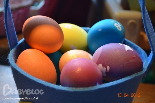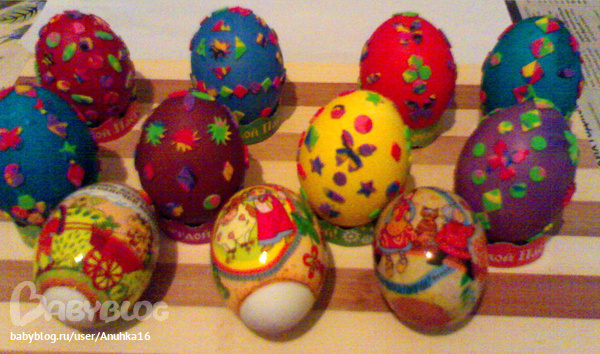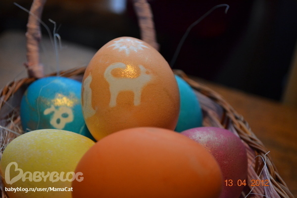 В этом году мы еще сына "припрягли")))) дали ему фломастеры - и яйцо. Но сын решил, что покраска себя - это лучше всего, и покрасил себя с головы до ног)))))