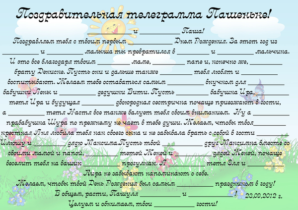 Естественно телеграмма. По опыту знаю, что это всегда проходит на ура. Вписывать в нее интереснее всех гостей.