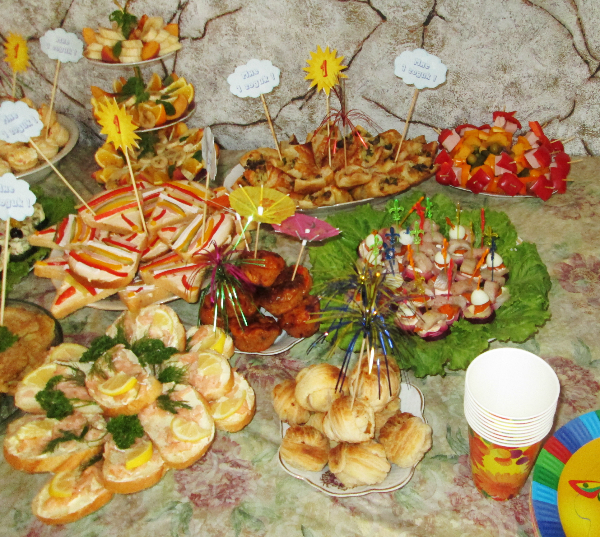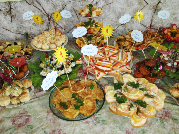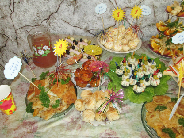 Теперь стол. Стол делала фуршетный, такой вид сервировки был для меня новым. Сейчас могу сказать, что такой вариант идеален для праздника, на котором будет много малышей.Конечно было немного тесновато, зато у ребятишек было место для игр и родителям не приходилось лезть через весь стол к своему ребенку.