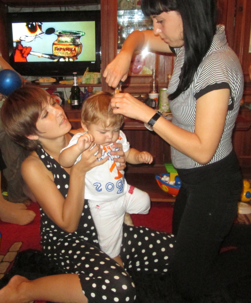 Крестный, к сожалению, не смог приехать, поэтому волосики обрезала только крестная, за что ей был вручен диплом.