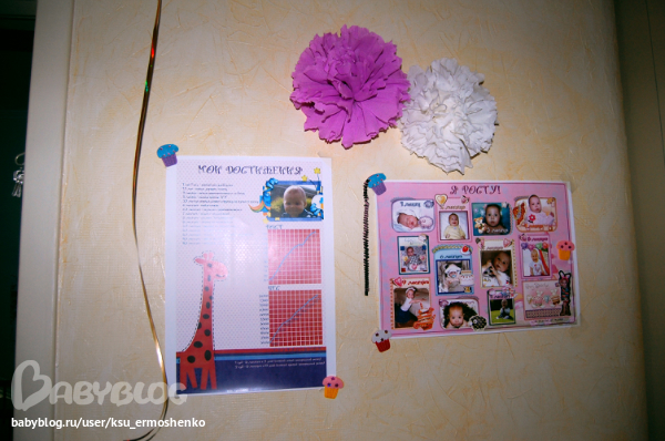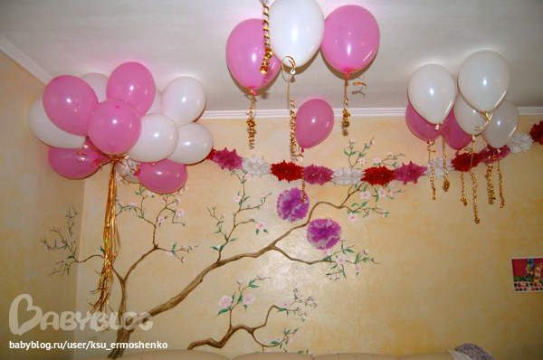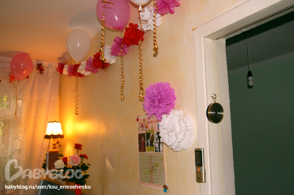 На стенах развешивала плакаты, посвященные имениннице, делала бумажные помпоны. А вот гирлянды покупала готовые, хотя собиралась делать сама. Была и надпись с днем рождения, но я ее не сфотографировала. Не успела, честно говоря. Надпись тоже покупная.