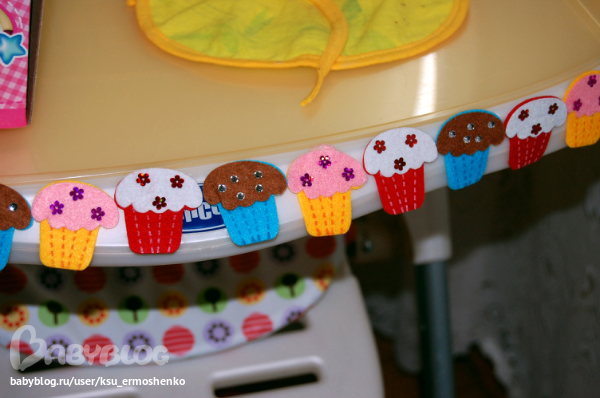 Стульчик именинницы украсила вот такими кексиками - просто обклеела по периметру. Веселенько получилось.