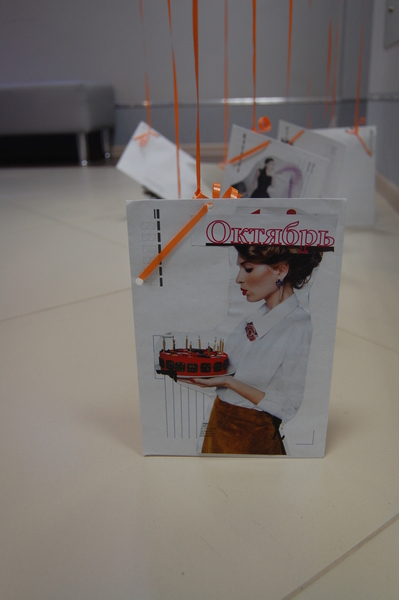 Затем в фотошопе был создан праздничный плакат, распечатан и разрезан на десять частей размером 10*15 см. Получившиеся изображения я отнесла администраторам нашего клуба и девчонки заваершили работу - наклеили их на плотные открытки, а с обратной стороны эти открытки подписали коллеги мужа.