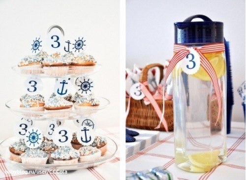 Кроме того, возможны различные варианты оформлений в рамках одного "морского"стиля: 1. обычный морской, с якорями, кораблями и прочей символикой, 2.достаточно распространненый вариант – пиратский, 3.с разными морскими жителями (рыбками, крабами) и 4.мультяшные варианты- "Русалочка", "в поисках Немо".