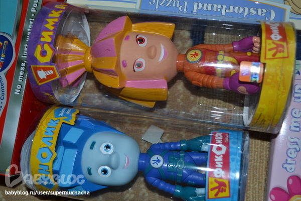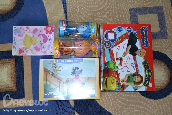 Пока это все и кое что еще по мелочи, посуда с китти, сама китти. Коврик с паровозиками, посоветовал в ЕЛС,говорят очень, клево. Но а фиксик это наша болезнь. а эти говорят и светятся)) Еще очень порадовала книга с наклейками х там очень много, для девочки просто суперр!!! Ну и пазл ну погоди, в дождливые вечера самое оно. А коробка где нарисована девочка, тоже купила в елс. Там девочка и на магнитах разная одежда к ней. Короче накупила все по мелочи, так как вообще не знала что покупать. Если кому помогу с идеей для подарка, буду рада!