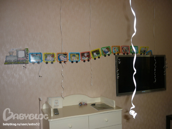 3. «Паровозик» тоже вырезала из цветной бумаги (вагончики и колеса), а в середину вклеивала фото. 12 фото из жизни каждого месяца, сам паровоз распечатала из интернета и раскрасила.