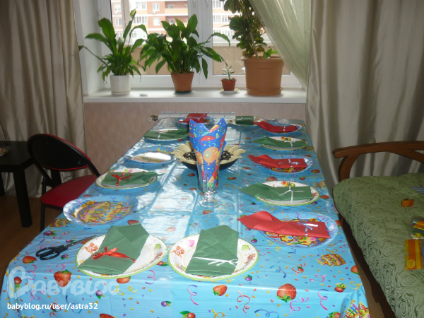Сам стол был сервирован детской одноразовой посудой, праздничными салфетками, шпажками, детскими трубочками. Особенно мне понравилась задумка, которую я позаимствовала у >>>>> салфетки, сложенные в виде конверта, куда вставлена вилка, Очень мило! Всю праздничную атрибутику я покупала в магазине «Пати-бум» сначала я нашла их в интернете и собрала все в корзину, хотела уже сделать заказ, но увидела, физический адрес, который расположен на Пражской, и так как это было недалеко, мы с мужем доехали, все потрогали, посмотрели и купили. Магазин по приемлемым ценам, сделан в виде супер-маркета разной праздничной продукции (на все случаи жизни)
