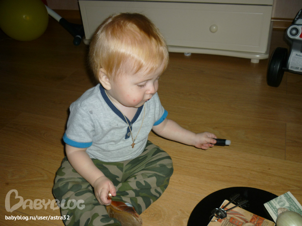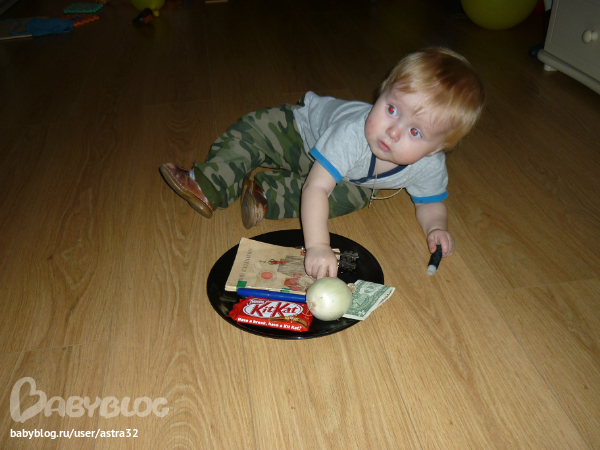 4. А-ля гадание. Что ждет в будущем именинника? выкладываешь на поднос разные вещи, что выберет малыш, то и ожидает) наш выбрал кольцо, сразу же его натянул на палец, затем схватил нитки и ключи)))