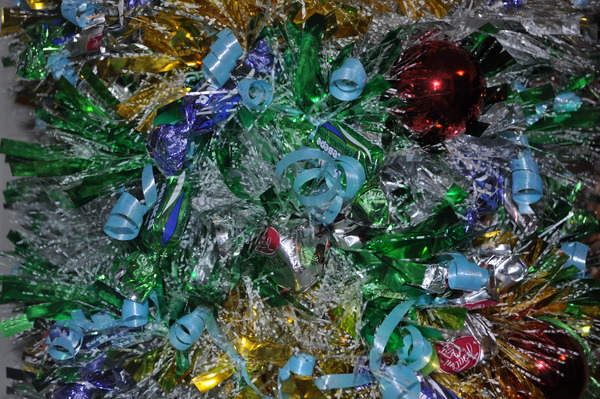 Спасибо! На 5-литровую бутылку мишуру намотала. А потом к мишуре привязывала шарики и конфеты.