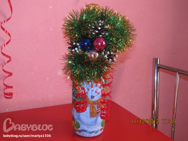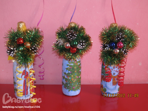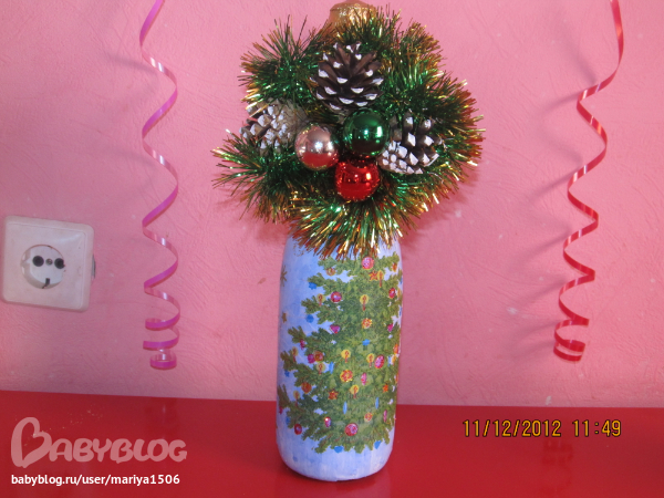 Мария, здравствуйте! Правильно я поняла вы на бутылку налеили сначала салфетку новогоднюю, а потом украсили мишурой и игрушками?