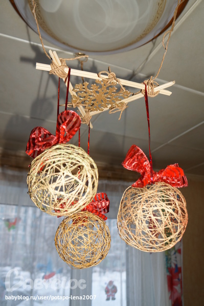 2.Решила смастерить шарики, как игрушки для ёлки и увлеклась, получилось украшение на потолочную люстру для кухни. Они золотого цвета, но на фото не очень видно. Такие же шары еще наделаю для ёлочки и покрашу в белый.