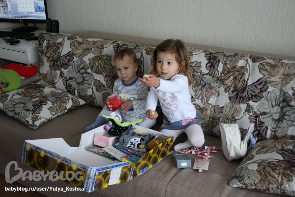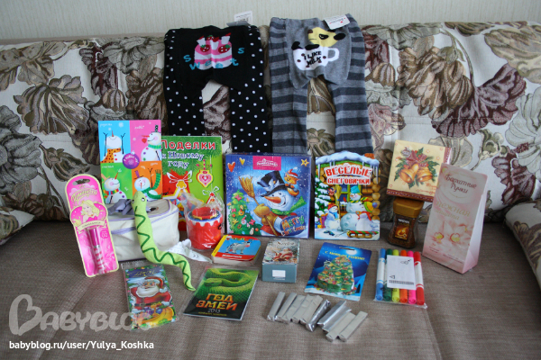 Вот сколько всего мы нашли в нашей коробочке!!! Лосинки деткам, чудесная книжечка с животными и пирамидка из стаканчиков для Глеба, змея, помада, фломастеры, книжечка с чудесными поделочками к новому году и книжечка про снеговичков для Есении, кофе и конфеты для папы, косметичка, полотенчико, набор кремиков для рук, чаёк, салфеточки для мамы!!! А ещё целая косметичка с конфетами, очень красиво завёрнутая шоколадка, коробочка конфет с пазлом-снеговиком, открыточка и календарь со змейкой!!!
