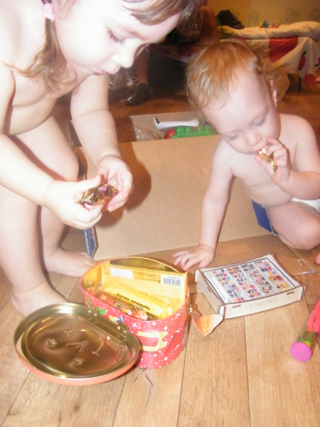 Скушав по конфетке, а кто-то и по две (Олеся спряталась с коробочкой у себя в кровати-манеже и открыла там сама еще одну конфету, потом только я успела припрятать "на потом"), принялись разбирать остальные подарки! Вот Леша радуется новому джипу! У нас больших машин мало, родители все место в квартире экономят, так что подарок очень оказался по душе! )))