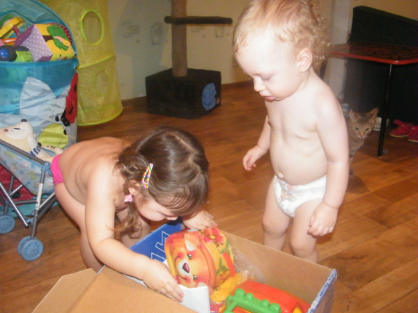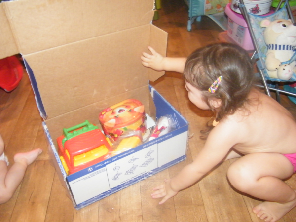 дети начали хватать быстрее, кому что)))) Ну у Олеси глаз на сладкое наметан уже! А Лешенька машину заметил было сперва...
