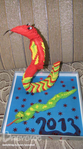 Новый ГодВ школу нужно было поделку смастерить, на тему НГ 2013. Вот что с сыном мы смастерили. Это первая наша работа в технике оригами. Сыну очень понравилось, недумала что его это так увлечет. В целом остались довольны. Даже жалко было отдавать.