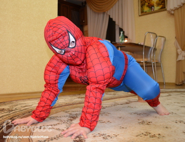 Зато в этом году Владя с удавольствием влез в костюм Медведя,он такой классный,тоненький но с классной мордашкой!!! Его я сфоткать ещё не успела,но зато в костюме Человека паука фото есть . Вот и оно: