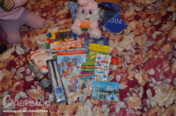 Чего там только не было и наборы для творчества, наклейки,трафареты, головоломки, фломастеры (блеск), бенгальские огни, вкусняшки ну и конечно для моей принцессы очаровательный зайчик. А еще мне подарочек перепал, салфеточки,свечечки, полотенчеко. Ну и конечно открыточка с замечательным городом