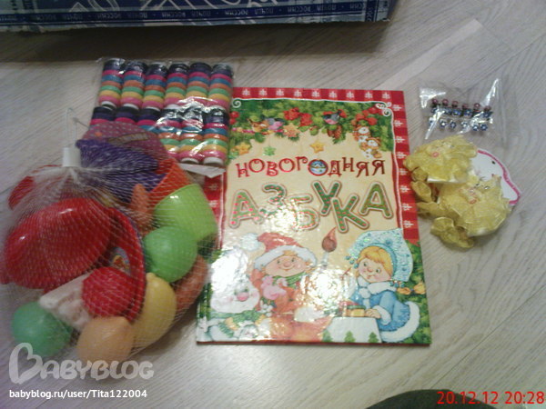 Это - для старшенькой: набор "все для чаепития" (сегодня они друг друга чаем поют :) ), КУЧА маленьких резиночек и заколочек и книжка с замечательными стихами (резинки с медвежатами - супер - сразу были одеты на волосы и остаток вечера мы ходили с нарядными хвостиками!) А еще набор карандашей (маленький) и набор фломастеров.