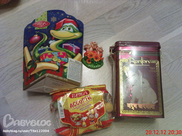 Это то, что досталось папе - чай (завтра обещал заварить на пробу), магнитик на холодильник, конфетки и сладкий подарок (мы его подарили нашей племяннице Алине - пусть она тоже верит в Снегурочку!).