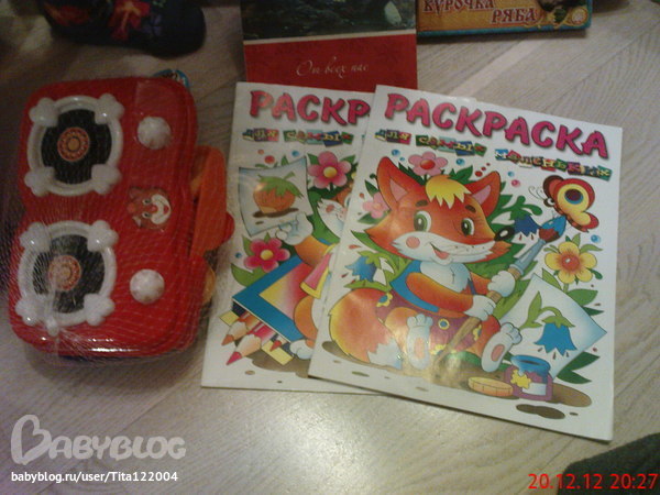 Это то, что при разделе имущества, досталось младшей доченьке: раскраски, набор карандашей (большой), посуда и печка с овощами (там вон еще Курочка ряба выглядывает).