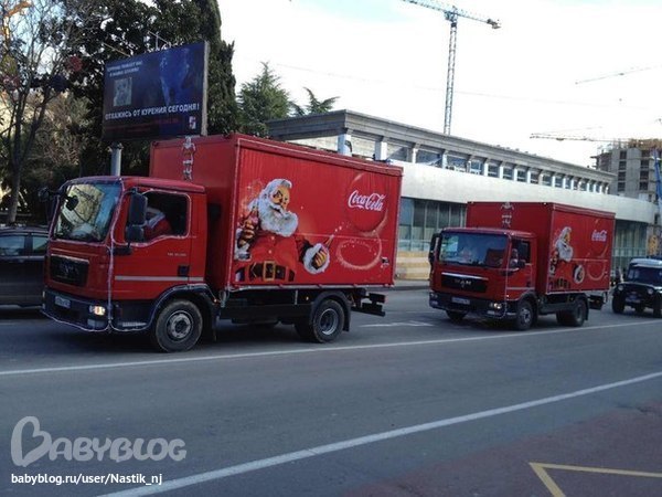 Так вот иду я сегодня по улице, и слышу до боли знакомую песню...поворачиваю голову, а там...они...грузовички кока-колы...в них сидел дед мороз, снегурка и кокакольный белый мишка, а на всю улицу играла их новогодняя песенка...Они конечно были маленькие, не такие как в рекламе, но такие у нас в городе по горным дорогам и не проехали бы))