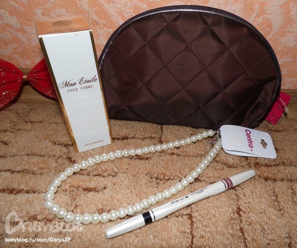 Мама - косметичка, бусы (она такие любит- у нее огромная коллекция), карандаш для глаз и губ Maxmar, и духи Mon Etoile Insolence (Guerlain). Вот