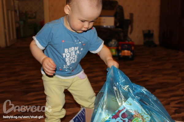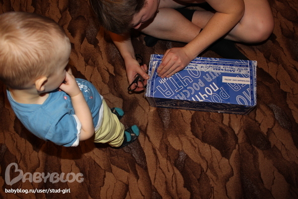 Папа наш больше всех рвался посмотреть что внутри,вот и помогал сыну вскрыть ее:
