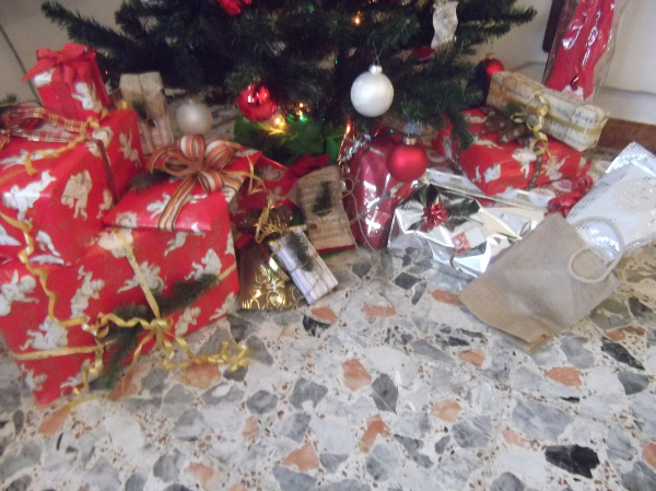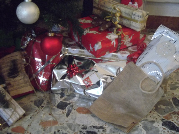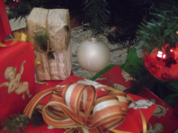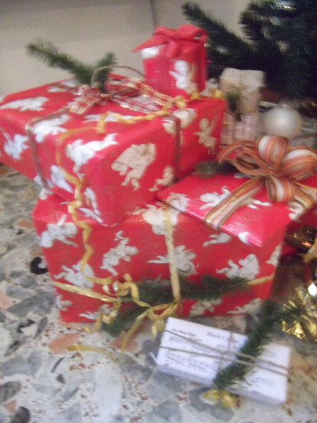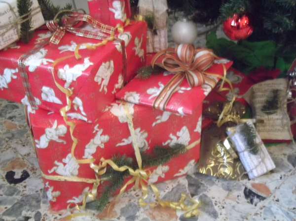 Люблю подарки в оберточной бумаге одного цвета. В этом году была красная с ангелами и золотистыми нотами. Все меня что-то на ангелочков-амурчиков и сердечки тянет в этом году
