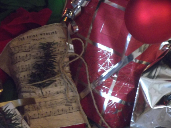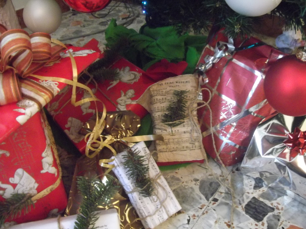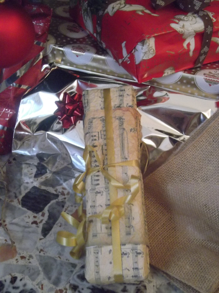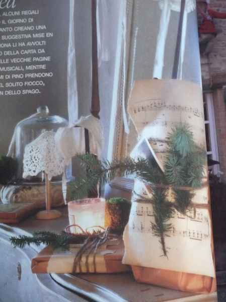 Бывает так, что не хватило бумаги (как и в моем случае). И я решила прибегнуть к идеям из журнала. Старых нот у меня не было. Из интернета взяла нотные листы, "состарила" их немного (смяла несколько раз до нужной кондиции). Вот и оберточная бумага готова. Приложила живую веточку ели. Очень, очень неплохо получилось. Что называется, дешево и сердито. Когда подарки открываются, столько этой бумаги рвется, выбрасывается!!!!