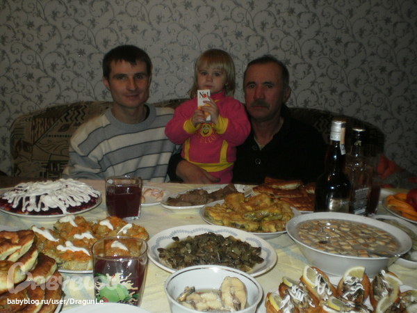 Ходили в гости к бабушке ... ) Готовили постные блюда , несколько разновидностей рыбы ( жареная , копчёная , фаршированная , консервы ... ммм... ) , салаты , варили кисель , делали бутики , пекли " ушки-галушки"