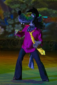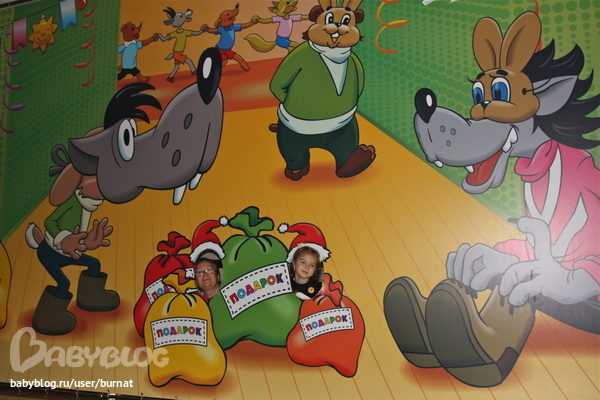 В фойе (куда зрители стали подтягиваться уже за час до начала) было множество игровых площадок, сказочных баннеров для фотографирования, аквагримеров и так любимой малышней ерунды, в виде светящихся жезлов, масок, мелких игрушек и тому подобного богатства. Мы позарились на диск с новой серией любимого мульфильма и книжку, по мотивам того же "Ну погоди". Также получили в качестве презента фирменный значок. Сами подарки выдавали уже на выходе. Вручили прикольный желтенький рюкзачок, я бы даже сказала 3D:) морда волка очень объемная и сбоку рюкзака еще прицеплен зайка. Само наполнение было скорее рассчитано на публику, которая жаждет зрелищ, чем хлеба. Конфет всего несколько штук. Также прилагался диск с нынешним и прошлогодними постановками и настольная игра с фишками. Чем мне еще нравится Крокус Сити Холл, что там все продумано. При входе всегда встречает множество молодых людей в ярких фирменных футболках, которые помогают сориентироваться и направляют в нужную сторону. В гардеробах одежду принимают и выдают тоже достаточно оперативно. Нет очереди, давки и во время получения подарков. Ну и несколько фото: