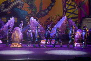 Посещение премьер на этой площадке у нас становится уже традицией. Впервые побывали там в прошлом году на "Чебурашке", очень понравилось. Этот год не стал исключением. Представление Лию впечатлило, меня тем более (я вообще гораздо быстрее и чаще проникаюсь постановками, чем моя попрыгунья-стрекоза). Правда, под конец спектакля Лия уже подустала сидеть, сползла с коленок моих и стала пританцовывать рядом. "Елка" шла без антракта, порядка полутора часов. Конечно, поражает размах: декорации, костюмы, свет, звук, количество персонажей, технические новшества. Расскажу, что Лие понравилось больше всего. В первую очередь - новая серия "Ну погоди", которую транслировали на огромном мониторе (на него же выводилась картинка всего представления). Было очевидно, что моей маленькой тусовщице явно мало и она жаждала продолжения. Поняв, что его не будет, она огорчилась, но ненадолго. Впечатлили огромные надувные зверушки, которые по ходу постановки летели из-под купола в зрительный зал. Откуда-то сверху катились полчища гигантских колобков. Они пружинили как мячики и каждый норовил колобка поймать и подбросить. По всему залу ходили гномы, феи и волшебники со сказочными кристаллами и дети могли к ним прикоснуться, что мы не преминули и сделать. В самом конце появился потрясающий гимнаст, который выделывал невероятные вещи находясь в гигантском мыльном пузыре. Лазерное мульт-шоу заслуживает тоже отдельных похвал. Во время самого представления не снимали, запечатлели себя на память уже в фойе. Но для наглядности взяла несколько снимков с сайта организаторов. Надеюсь, они не будут в обиде.