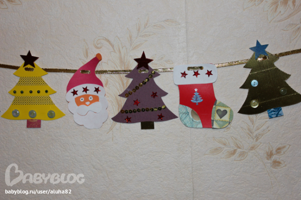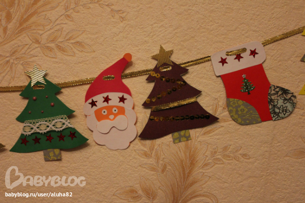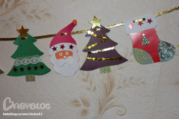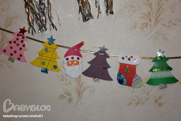 Гирлянда чуть-чуть покороче получилась и может немного попроще. Но прям смотрю на нее и так мне кажется она у нас хорошо в комнате смотрится. А в садике кстати были все очень удивлены такой гирляндой. Сказали, что никогда такого не видели. Из всего садика мы попали в тройку победителей. Причем разделений на 1, 2 и 4-е тместо не было. Просто три самых лучших работы.