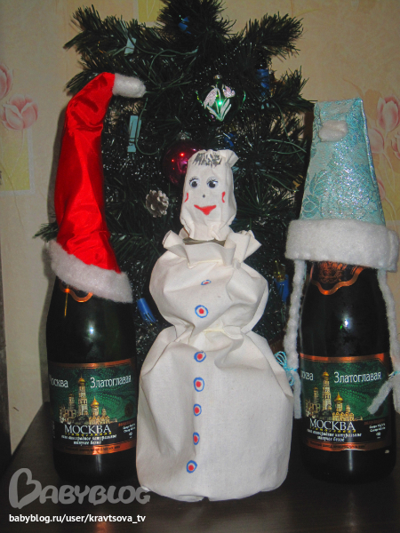 Стандартная елочка, совсем небольшая, с веселой компанией напитков))) по середине - это графин-снеговик...