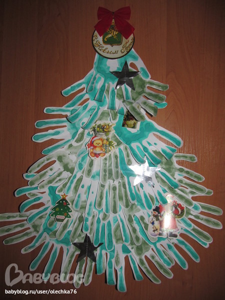 Очень понравилась елка из ладошек, которую мы с сыном решили сами сделать. Больше всего нам понравился вариант из отпечатков, сказано-сделано. Думали и Аленкины ладошки отпечатать, но перепачкались втроем настолько, что решили ограничиться моими и Лешкиными. (папа на работе, его не задействовали). Зато Аленка была в полном восторге от того , что мама и брат ходят с зелеными руками