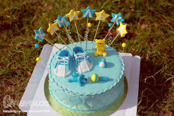 Спасибо огромное Диане http://www.babyblog.ru/user/lenta/alexart1980 за такой красивый и нереально вкусный торт, руки у неё просто золотые. Смело могу сказать, что нам теперь и на будущее есть, чьими услугами пользоваться и кого всем рекомендовать! Даже Камилька успел незаметно схватить и слопать один шарик на пружинке, а ведь я планировала приготовить для него отдельный детский тортик и не поверите, забыла… Если вдруг кому актуально, делюсь незамысловатым рецептом – детское печенье чуть-чуть смочить смесью или молоком слоями на блюдце, затем эти слои промазать творожками разных цветов, ну а сверху выложить фрукты )