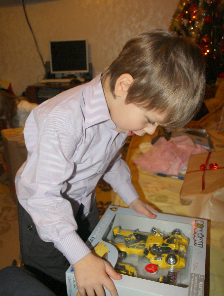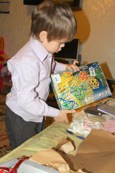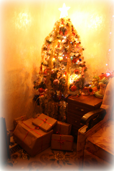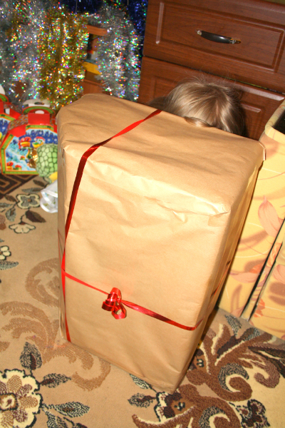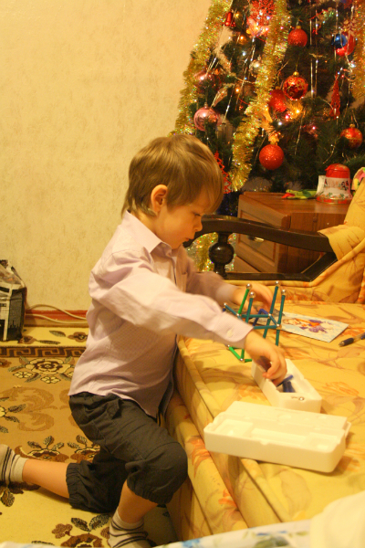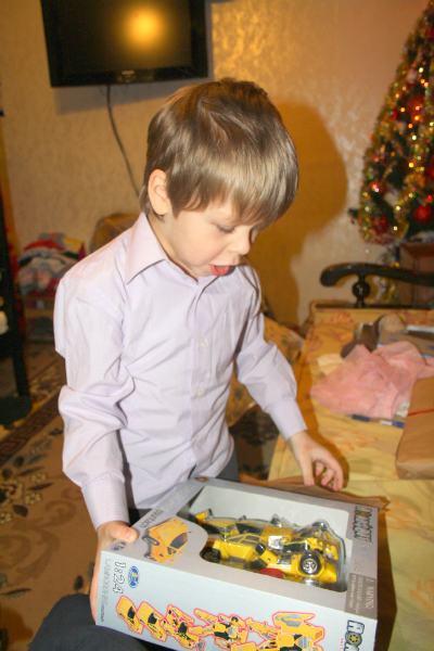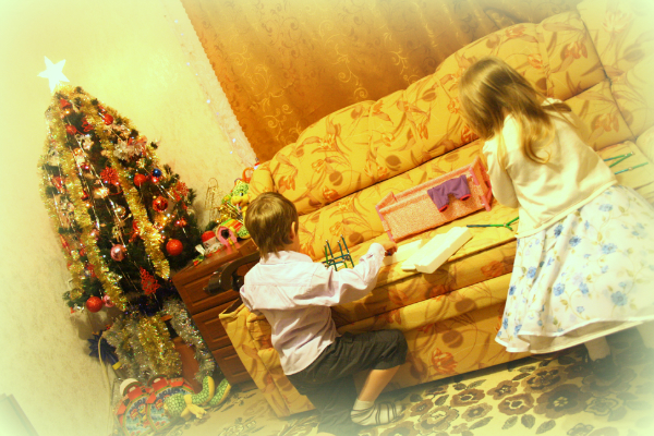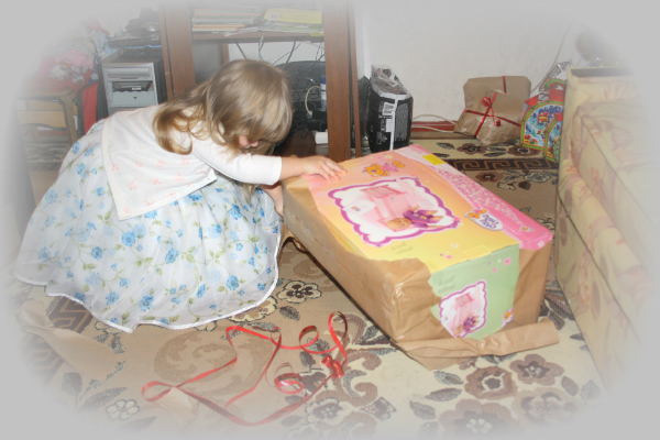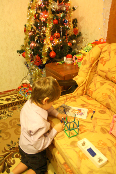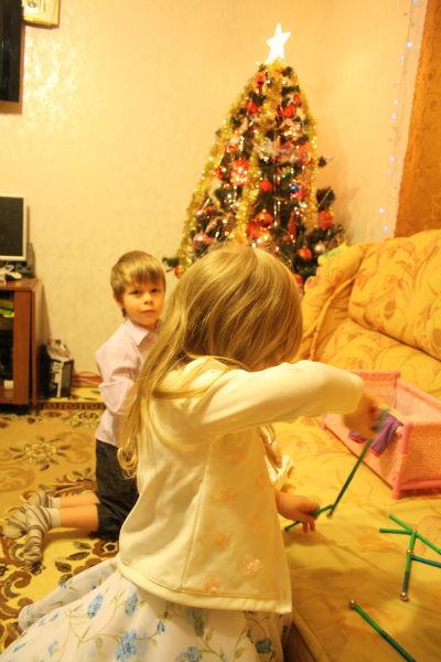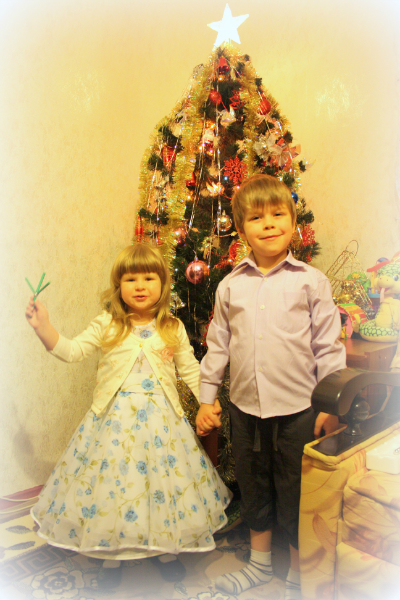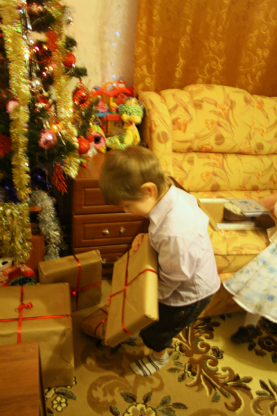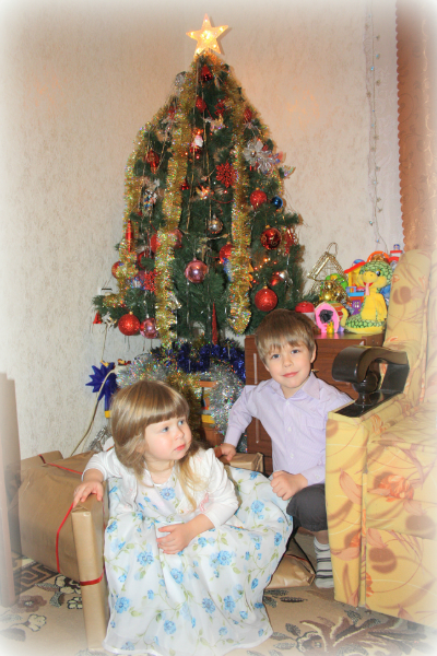 Вдоволь нагулявшись,пришли домой,пока я переодевала деток в праздничные наряды,муж сходил за подарками в машину,подложил их под ёлочку-холодные с мороза))Подарки у нас заранее чуть-потому что по традиции мы уезжаем 1 или 2 января к моим родителям на все праздники,родителей надо не забывать и навещать,как далеко бы они от вас не жили)))
