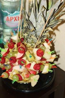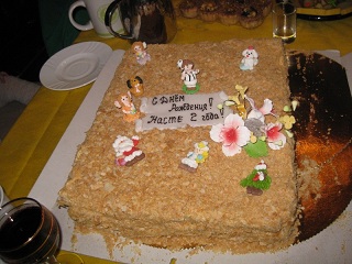 На столе было много разных канапе, салатиков, вкусностей. Торт был сделан на заказ, т.к. крестный Настены работает поваром. Каждый год торт нам обеспечен!! Конкурсы решила никакие не делать, т.к. коллектив был разого возраста и всем хотелось поболтать. А малыши еще ничего толком не поймут.