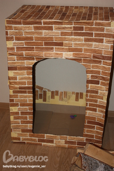 Пламенем у меня служили елочные огоньки, можно взять фонарь укрыть его красной тканью, или нарисовать пламя, поставить на подставку, а сзади установить лампу… Внутрь камина были уложены настоящие дрова.