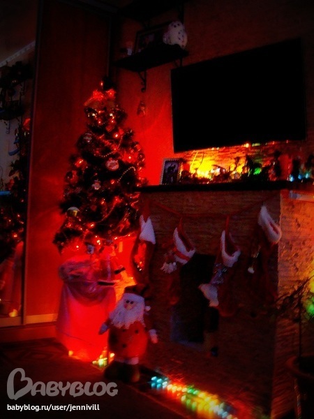 Ищем свои подарочки в носках, которые каждый год вешаем на камин, (правда раньше вместо камина у нас там был комод:) В эти носки каждый кладет друг другу какие-нибудь маленькие приятности. В Этом году мне муж положил туда блок жевачки Love is, вот это был сюрприз:)