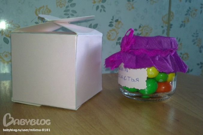 Вот! ) Весь подарок получился самодельный ))) Вид сверху) - Пилюли в баночке от детского питания)) и коробочка для них с инструкцией Вид сбоку )    И весь подарок ) Пилюли, самодельная открытка (еще недоработанная) и фотокнига.
