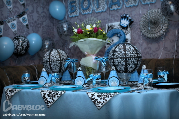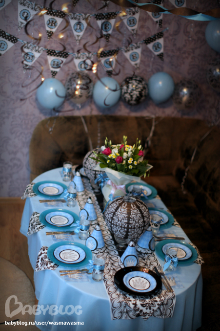 даже не знаю с чего начать, такого я еще не видела, все продумано до таких мелочей, скатерть , оформление , торты оба — это шедевры, вы красавица молодая и красивая мамочка, и сынуля копия папа, супер семья и супер др, остаюсь род впечатлением