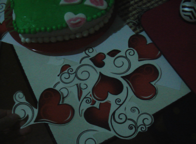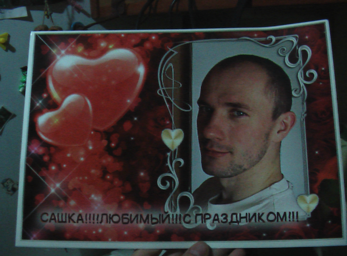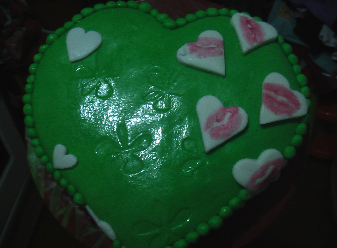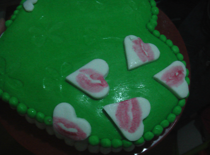 Второй сюрприз сладкий.Это торт.Делала сама.Бисквит+ооочень много сгущенки с изюмом.И мастика.Сердечки украшала отпечатком своих губ.Так как это торт для близкого человека отпечатки губ делала с помощю помады.Накрасила губы и поцеловала сердечки))))Сердечки можно не кушать,но что то мне подсказывает что Сашка их съест))))))Выемки цветов делала бутылкой)))))