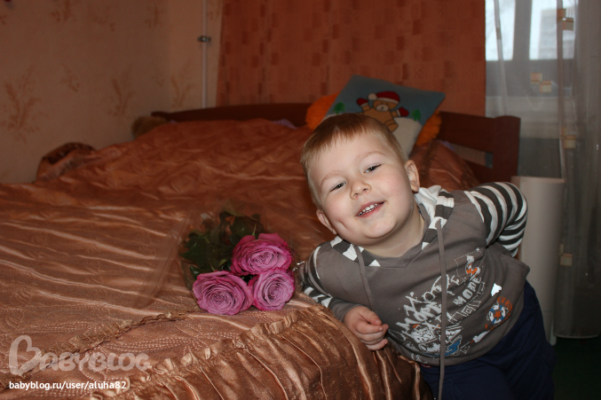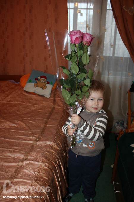 Не успел наш папочка зайти толком в квартиру, как букет для меня, был у него забран. И в результате цветочки я получала из ручек моего самоего любимого сыночка, зато поцелуйчики достались мне от обоих.
